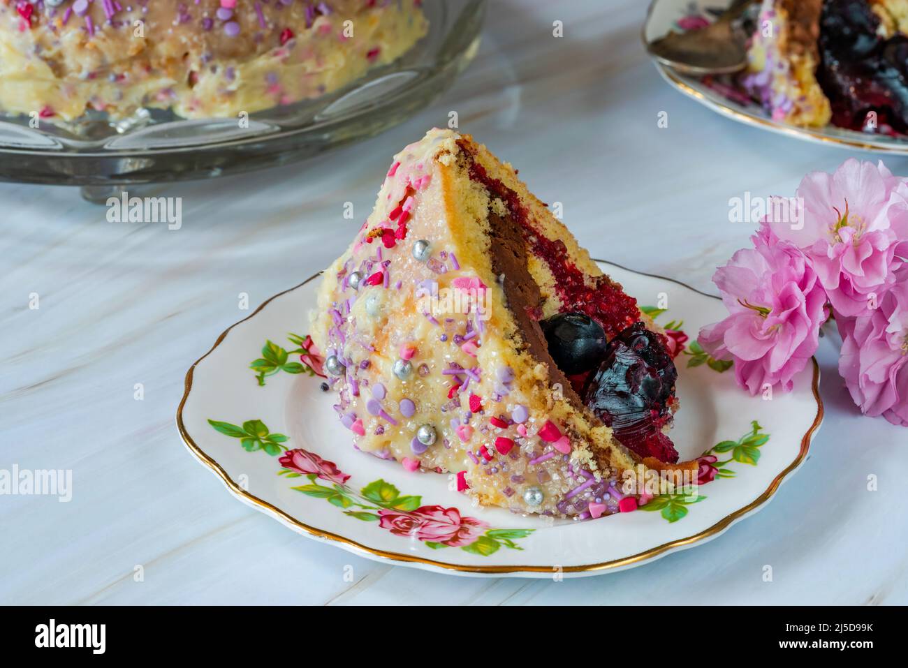 Dome Cake Filled With Fruity Jelly Dark Chocolate Mousse And Raspberry Puree Covered With White Chocolate Ganache And Decorated With Colorful Spri Stock Photo Alamy